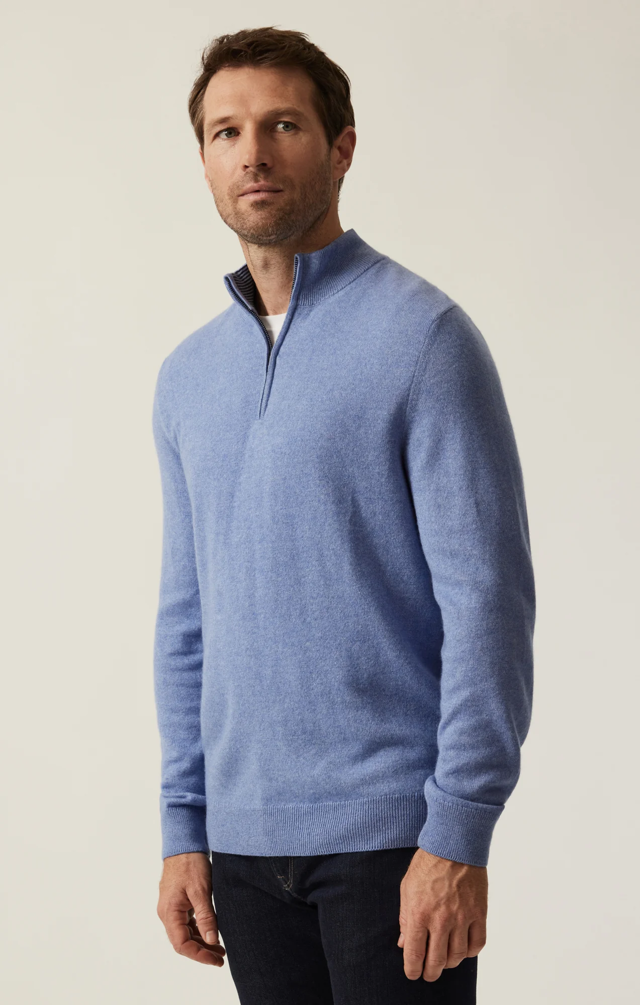 Engineered with premium, ultra-soft cashmere and silk, this luxurious quarter zip sweater is a cold weather staple you’ll reach for again and again. Finished in a sky blue hue with a striped collar detail, this polished piece is versatile for casual, everyday wear, as well as dressier celebrations.